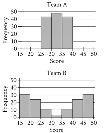 \(\begin{aligned}&\text{The histograms summarize the distributions of scores for team A and team B. Which}\\&\text{statement best compares the standard deviations of scores for these teams?}\end{aligned}\)