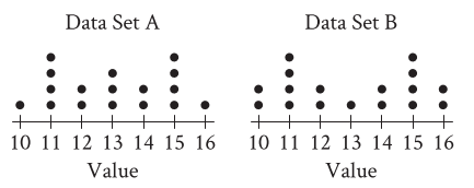 \(\text{The dot plots represent the distributions of values in data sets A and B.}\)