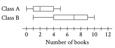 \(\begin{aligned}&\text{The two box plots show the distribution of number of books read}\\&\text{over the summer by the students in two different English classes.}\\&\text{What is the positive difference between the ranges of number of}\\&\text{books read over the summer for the two classes?}\end{aligned}\)