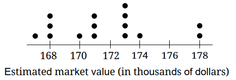 &\text{The dot plot shows the estimated market values for 15 houses in a neighborhood. What is}\\