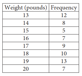 \(\begin{aligned}&\text{The frequency table summarizes a data set of the weights, rounded to the nearest pound, of}\\&\text{71 tortoises. A weight of 39 pounds is added to the original data set, creating a new data set}\\&\text{of the weights, rounded to the nearest pound, of 72 tortoises. Which statement best compares}\\&\text{the mean and median of the new data set to the mean and median of the original data set?}\end{aligned}\)